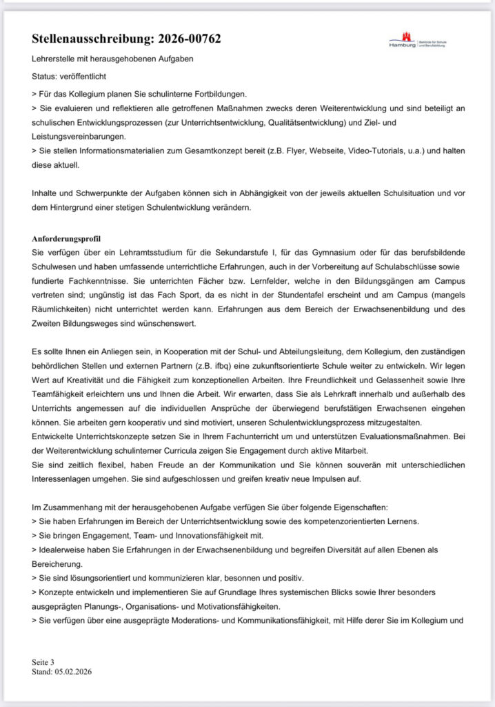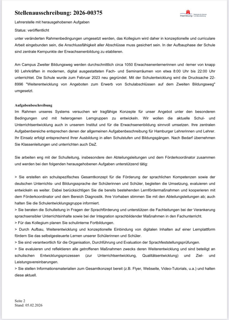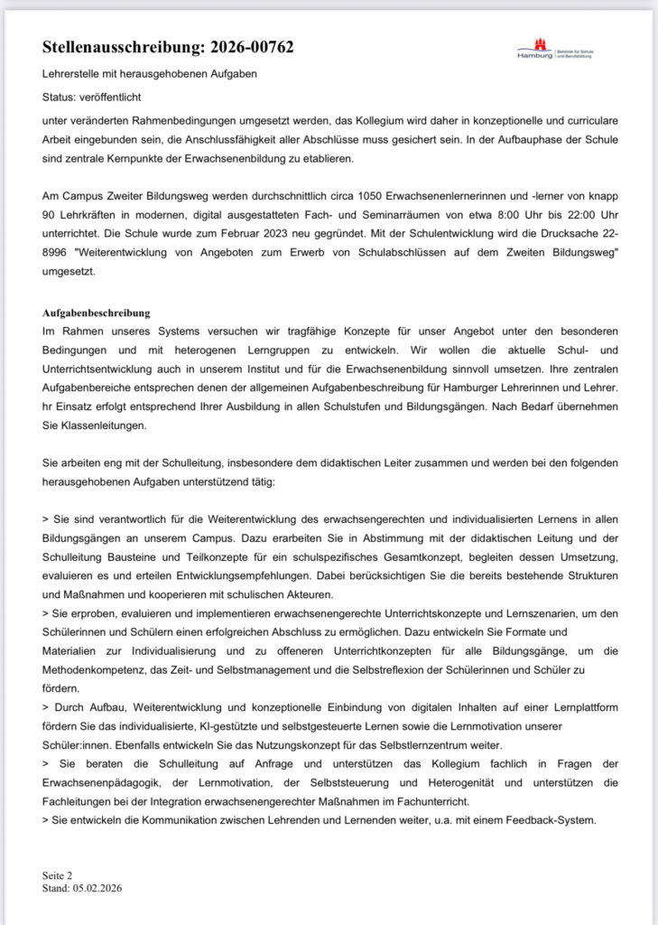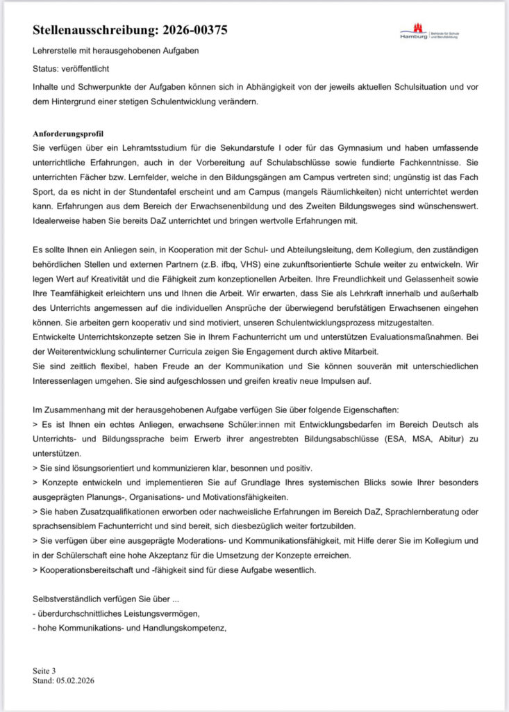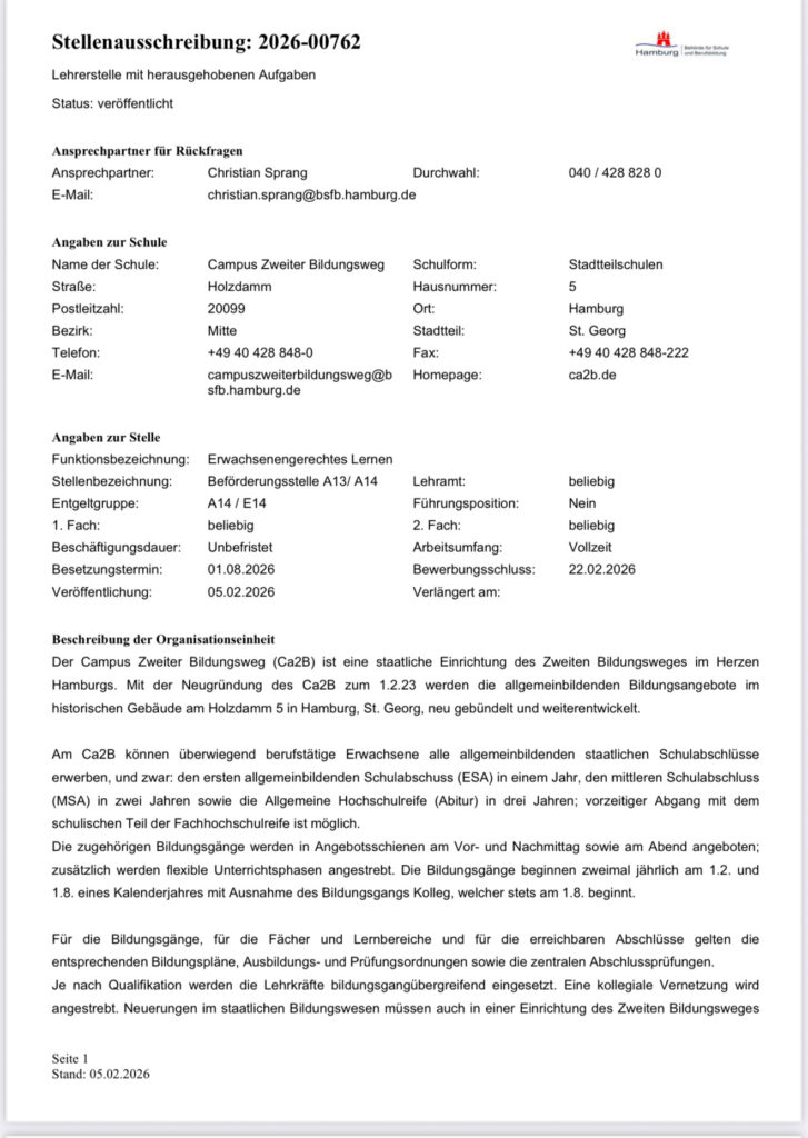 AllgemeinAktuelle Stellenangebote A14 am Campus By ca2b 6. Februar 2026 6. Februar 2026 https://serviceportal.hamburg.de/hamburggateway/fvp/fv/BBS/pbOn Der Chor startet wieder!Open Stage am Campus Zweiter Bildungsweg